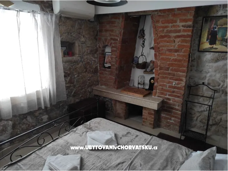 Kuća s dvorištem i natkrivenim parkiralištem u mirnom starom dijelu mjesta, udaljena od plaža 25 min pješice i 5 min autom, u prizemlju terasa s nadstrešnicom, vrt, vanjski tuš, roštilj, open space blagovaona, dnevni boravak i kuhinja (pećnica, perilica suđa, mikrovalna, aparat za kavu), soba, kupaonica, perilica rublja, a na katu soba s velikom terasom s pogledom, wi-fi.