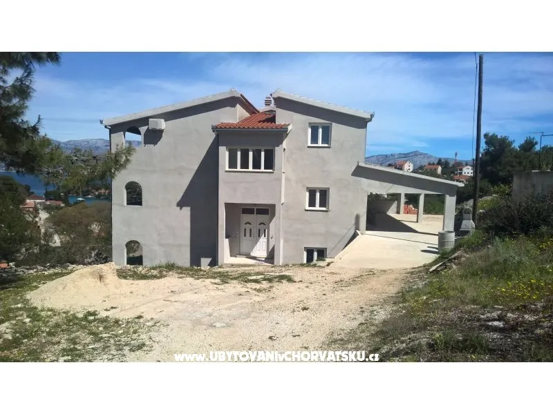 Kuća je novogradnja na dva kata sa visokim potkrovljm.Idealno je za dvije obitelji jer mogu biti i odvojeni i zajedno. Ima natkriveni parking.Okruzena borovom sumom, velika terasa 40 kvadrata koja pruza prekrasan pogled na more i cijelo mjesto.Uredena betonska plaza u samom mjestu udaljena 200m isto tako uredena sljunćana plaza na samom ulazu u mjesto udaljena 800m.U kući nitko ne živi tako da je cijela Vaša.Kuća za odmor.