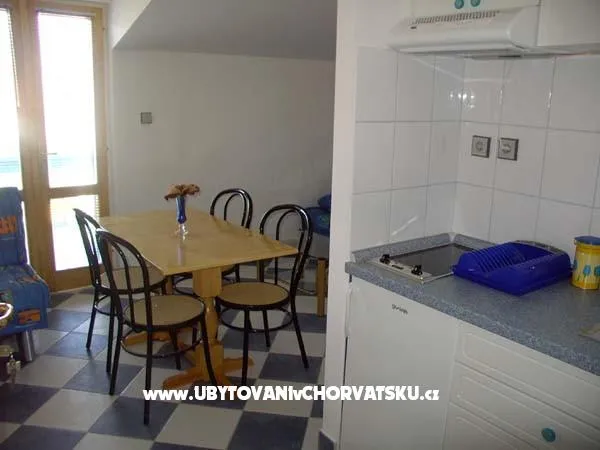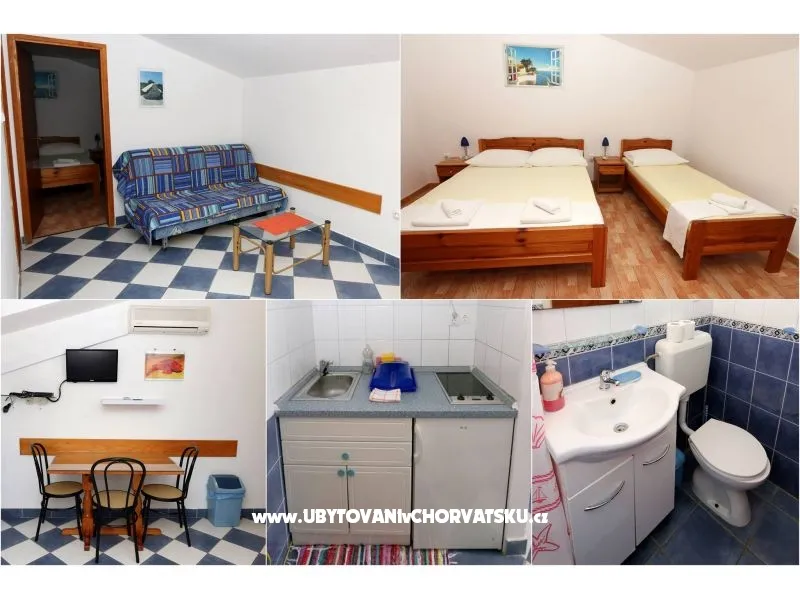Jednosobni apartman sa 2 balkona.U spavaćoj sobi je bračni krevet i singl krevet, u dnevnoj sobi bračni krevet trpezarija, kuhinja, wc, klima, tv.Pteporuka smještaja za obitelj.