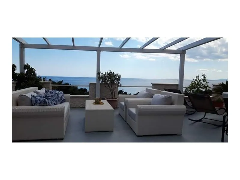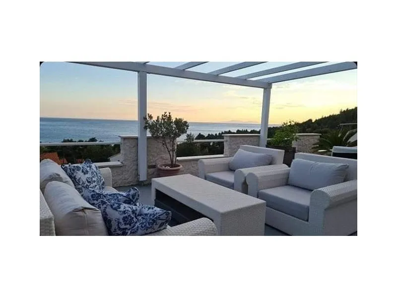 Apartman za 5 osoba, 2.kat, 45m2. 2 sobe, kuhinja, kupatilo i terasa s pogledom na more. Soba 1: bračni krevet 160x200 cm + krevet 90x200cm. Soba 2: bračni krevet 160x200 cm. TV, klima uređaj i WI-FI Internet. Parking. Roštilj. Perilica na upit.
