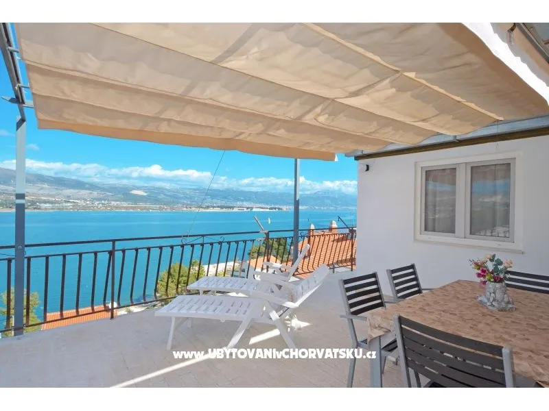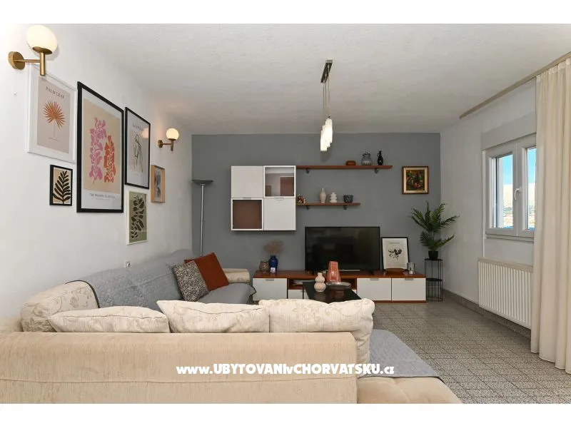 Površina: 72m2 + 42m2 Balkon /terasa pogled more, 2 spavaće sobe, 1 kupaonica, TV SAT, vanjski roštilj, 1 privatni parking, 1. kat, 70 m od šljunčane plaže, Perilica rublja kod vlasnika uz nadoplatu 5