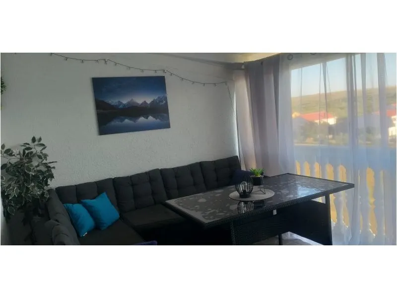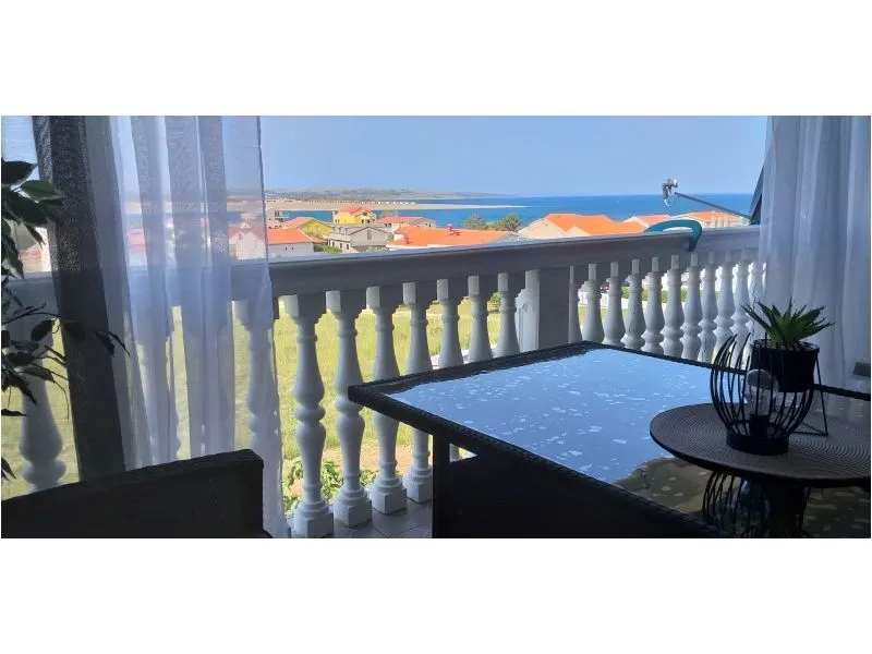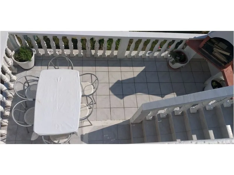 App.se nalazi na 2.katu,poseban ulaz iza kuće.Sastoji se od 2 spavaće sobe,boravka,kuhinje,kupaone i terase od 15m2 sa prekrasnim pogledom na more.Kuhinja opremljena sa suđem,aparat za kavu,toster